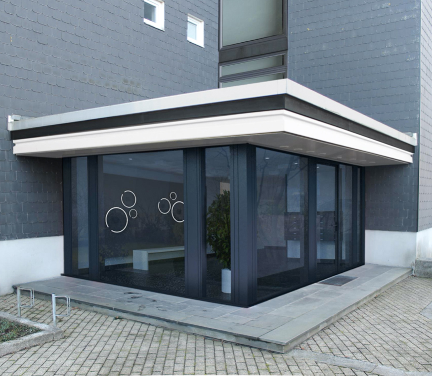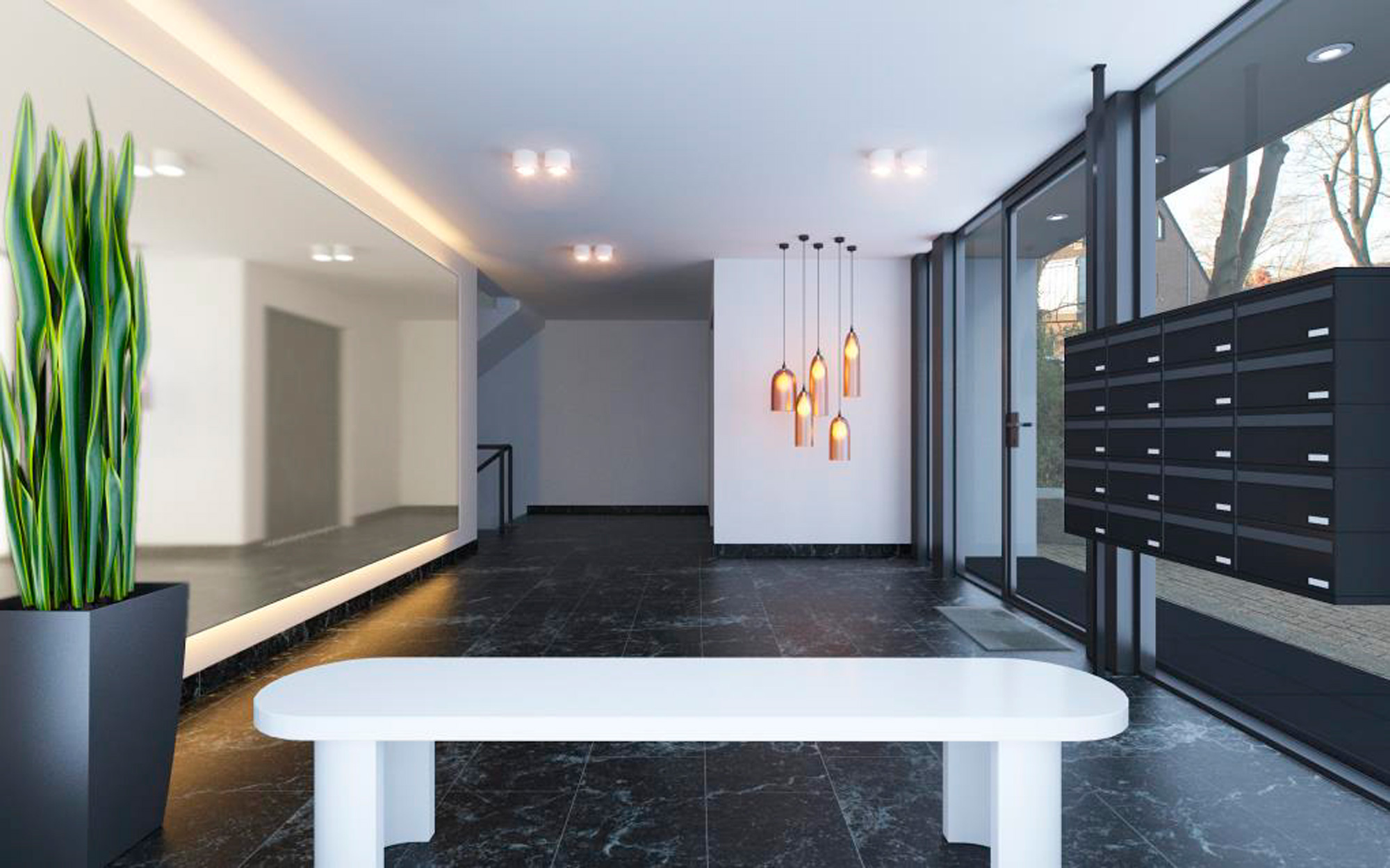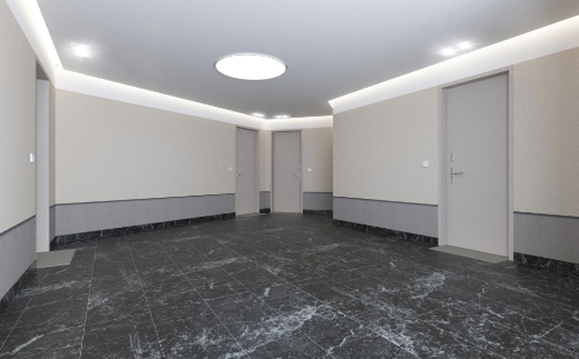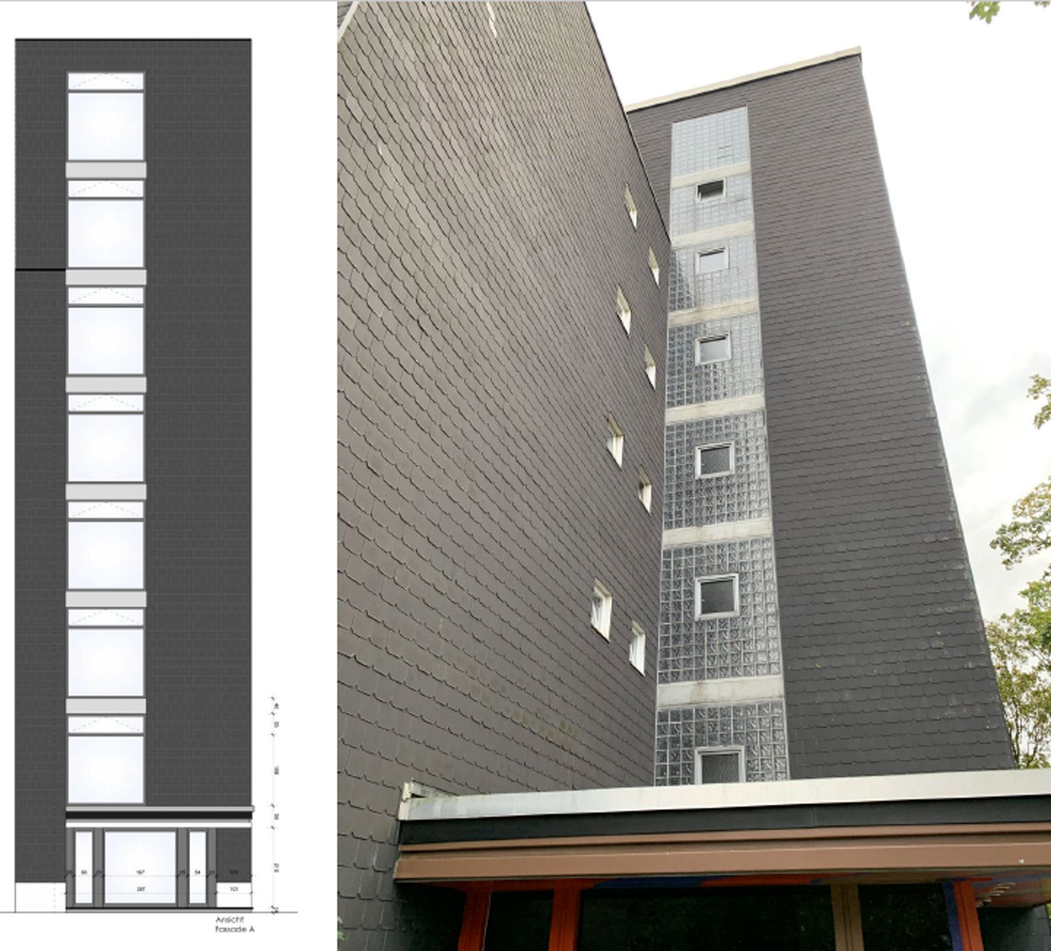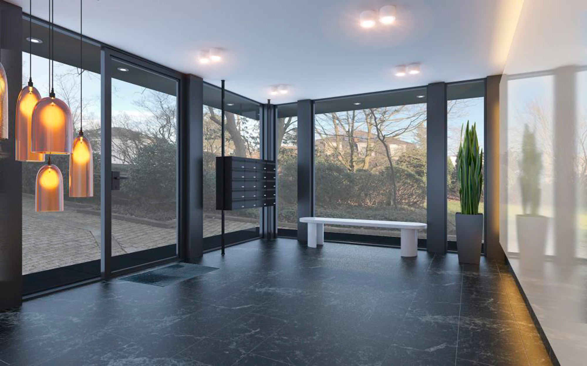 Gestaltung und Umbau des Eingangs- und Flurbereichs eines Mehrfamilien- Hochhauses aus dem Jahr 1969. Der Entwurf sollte das Thema des Eingangsbereiches als wertiger Empfangsbereich beibehalten und wiederaufnehmen. Die niedrigen Flur- und Treppenbereiche aufgewertet werden.